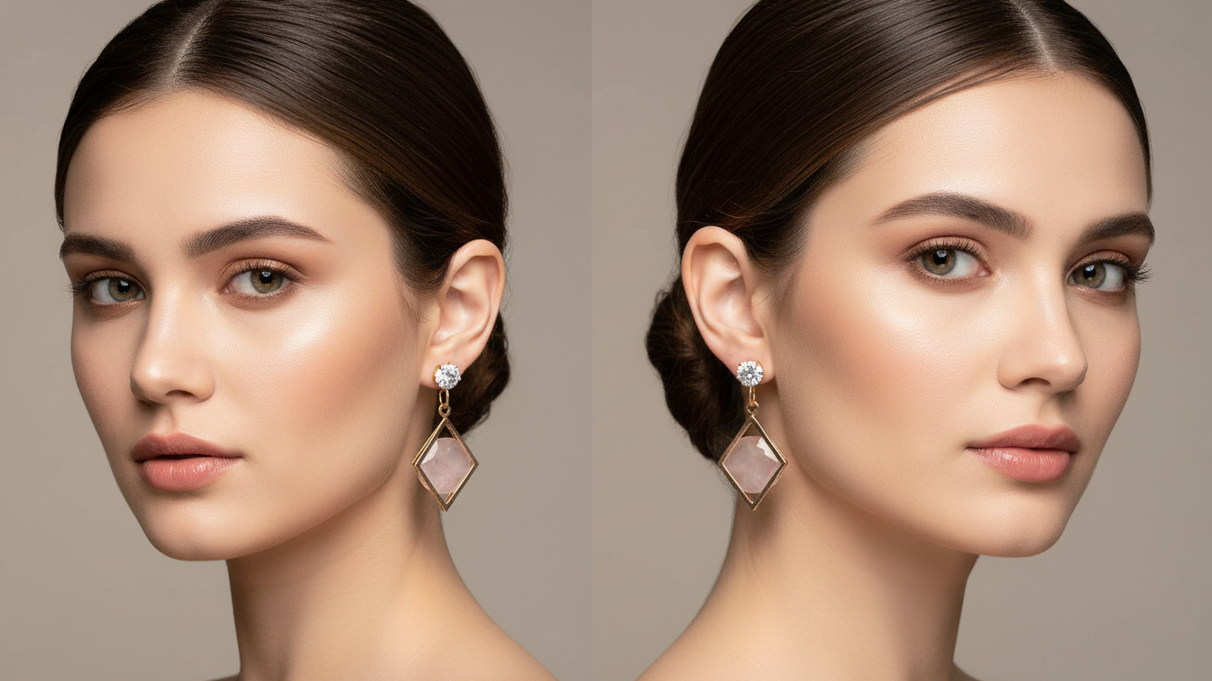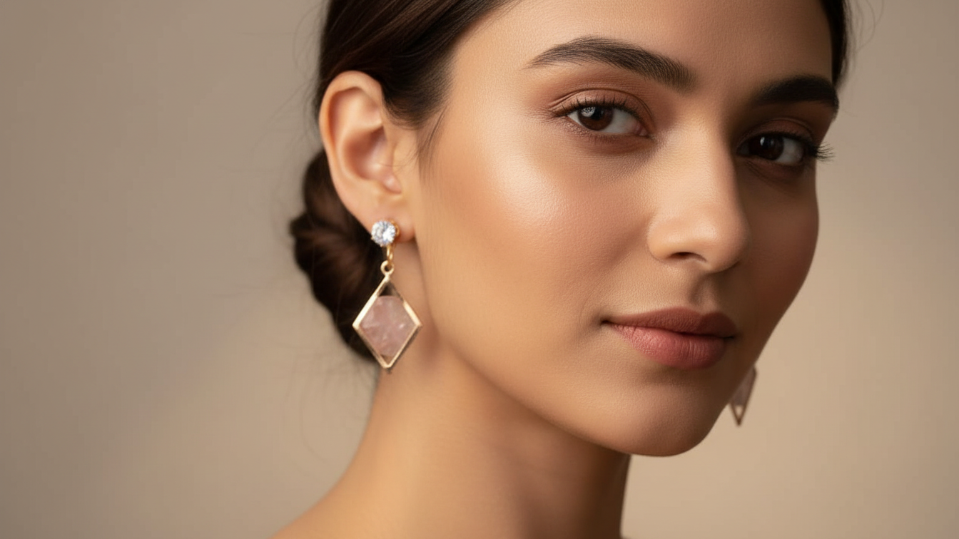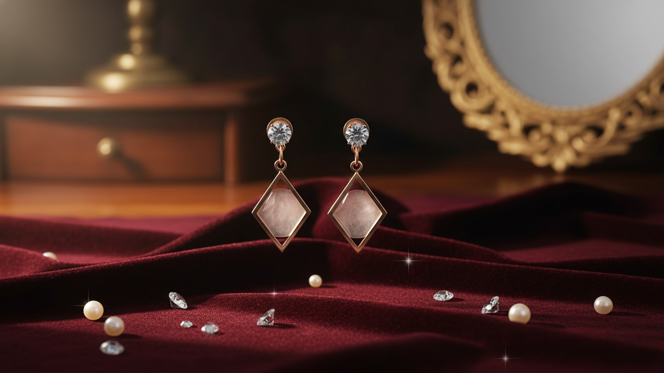 Gold Diamond Shaped Drop Earrings. Featuring a beautiful combination of rose gold framing and a clear, sparkling gemstone on top, these earrings offer an elegant, contemporary design that complements any occasion. Whether you’re attending a formal event or a casual outing, these earrings add a touch of sophistication and charm to your look.
