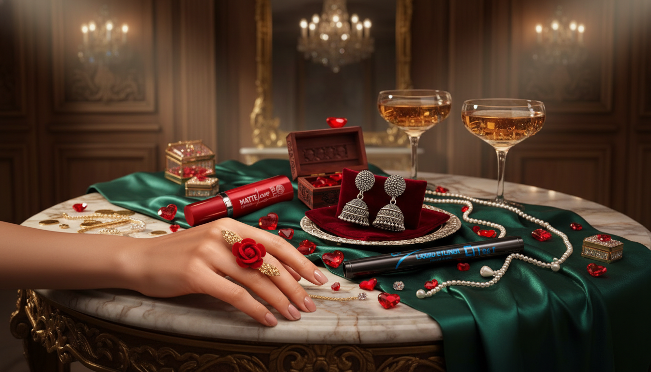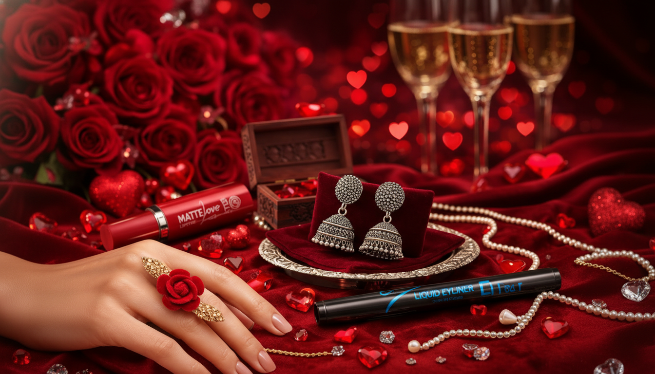 Designed as a Valentine Day special gift, this makeup and jewelry combo blends beauty and tradition perfectly. The lipstick eyeliner combo enhances makeup with long-lasting color and sharp definition, while the traditional jhumka earrings for women add ethnic charm. The rose ring symbolizes love, making it an ideal love gift combo.