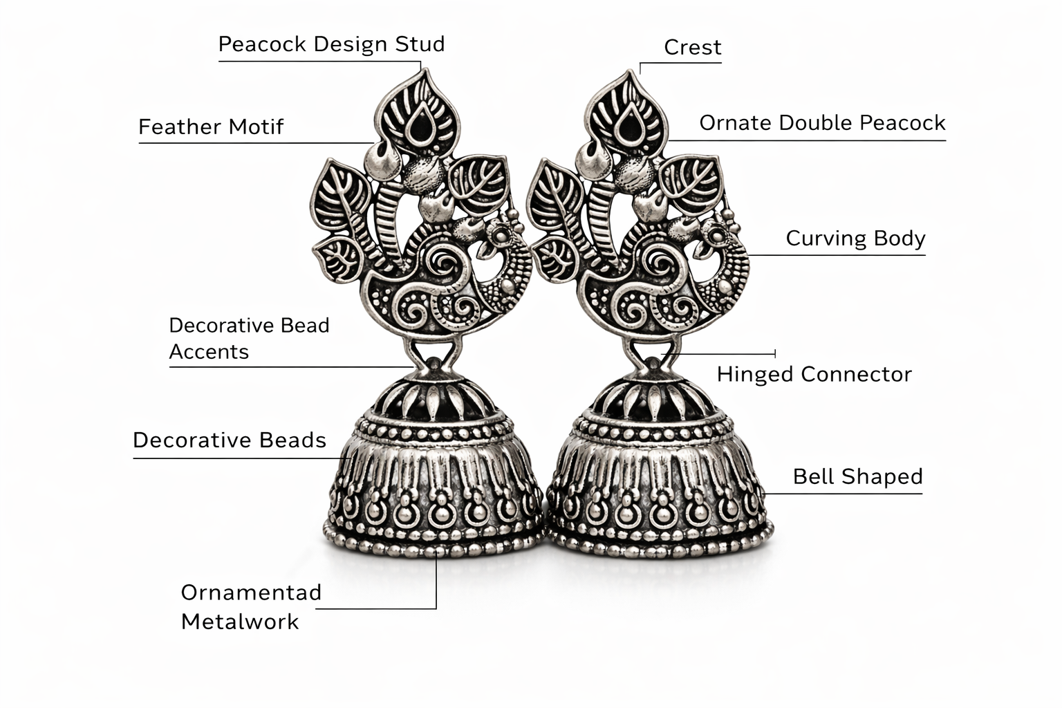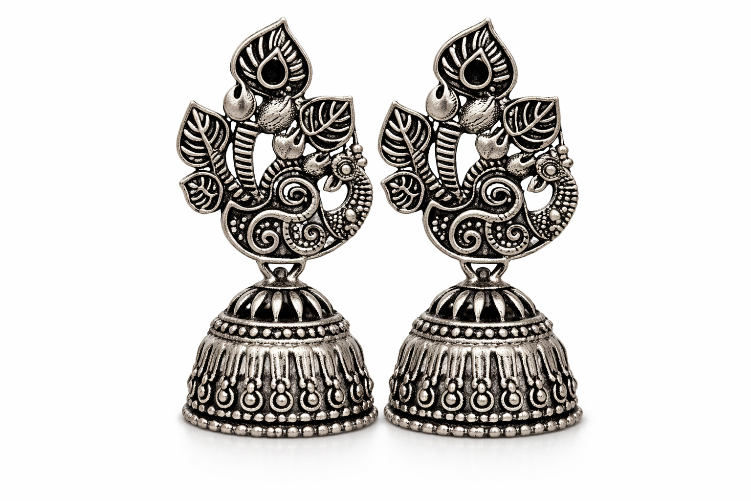 Shopyanatra Antique Oxidized Silver Peacock Jhumka Earrings. Beautifully crafted with an intricate peacock motif and traditional engraved detailing, these earrings reflect classic Indian heritage with a bold ethnic charm.