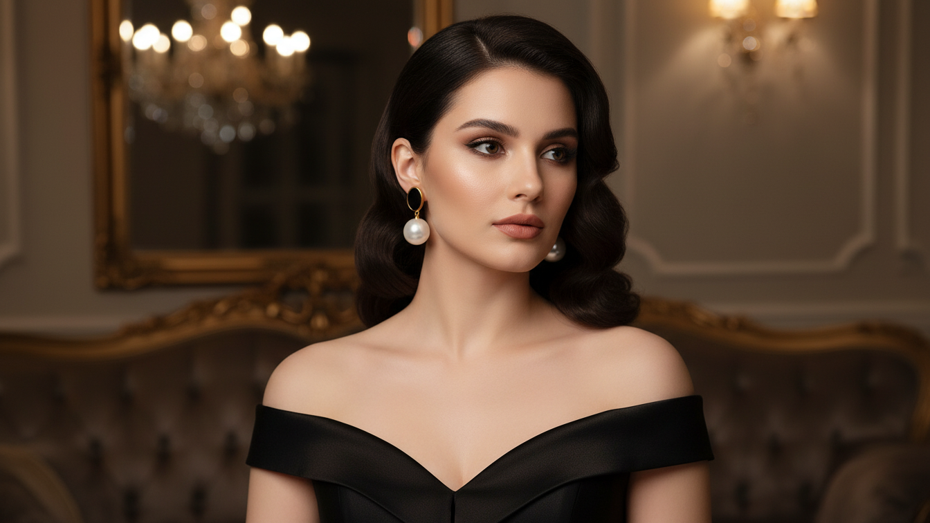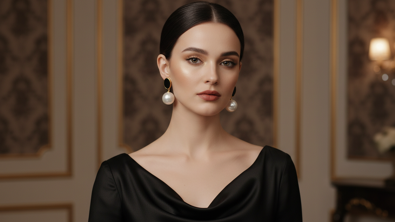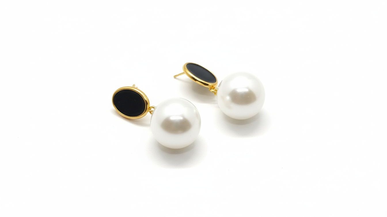 Shopyanatra Elegant Pearl Drop Earrings. These exquisite earrings feature a sophisticated black accent at the top, with luxurious faux pearls hanging gracefully below. The gold-plated base adds a touch of class, making these earrings a perfect accessory for weddings, parties, or any elegant event. The combination of black and pearl creates a stylish contrast that enhances the overall look, adding a chic, modern flair to your jewelry collection.